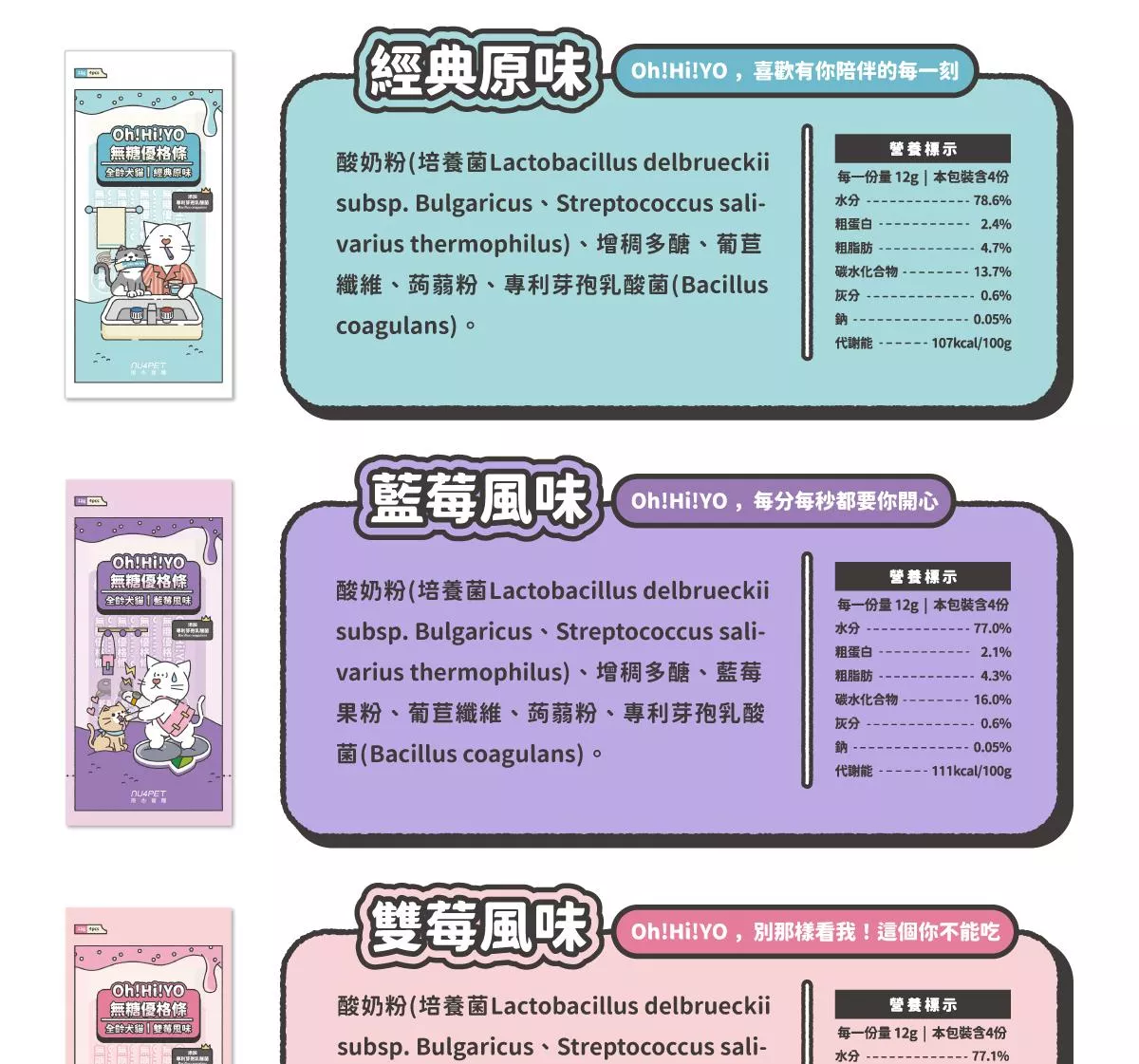 【成 分】全系列共5種口味(經典原味 / 起司風味 / 藍莓風味 / 雙莓風味 / 羊乳風味),內容詳見下方產品資訊