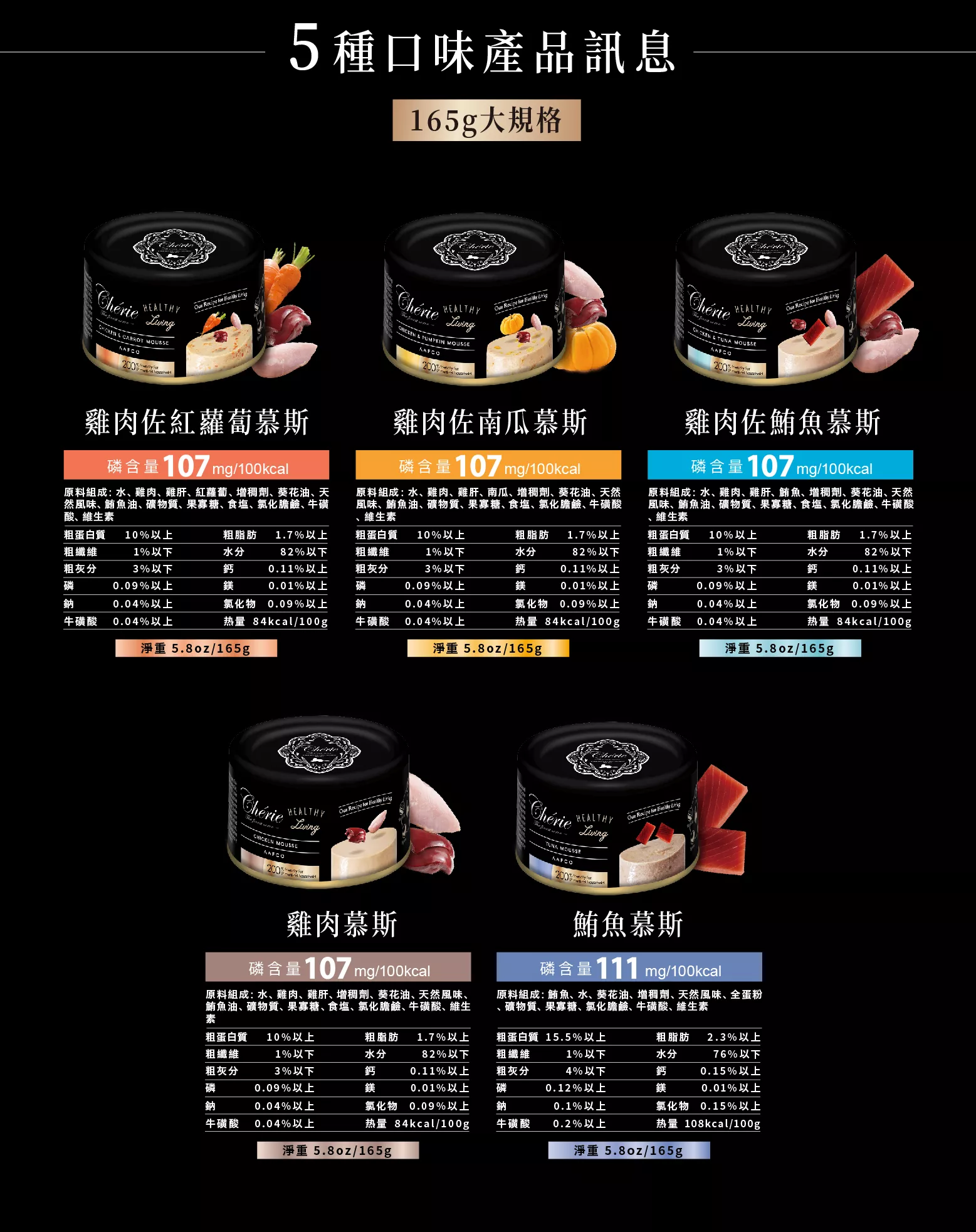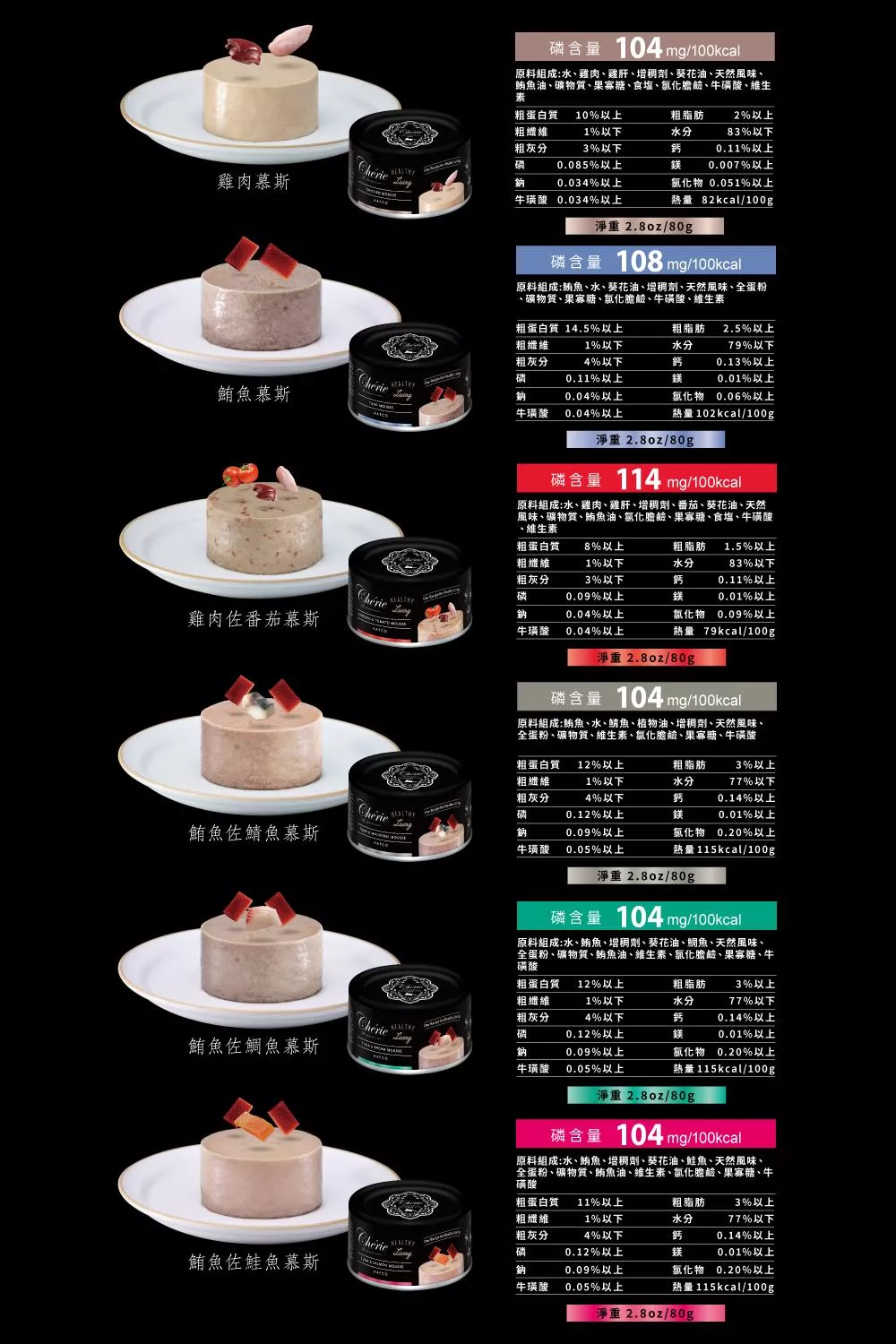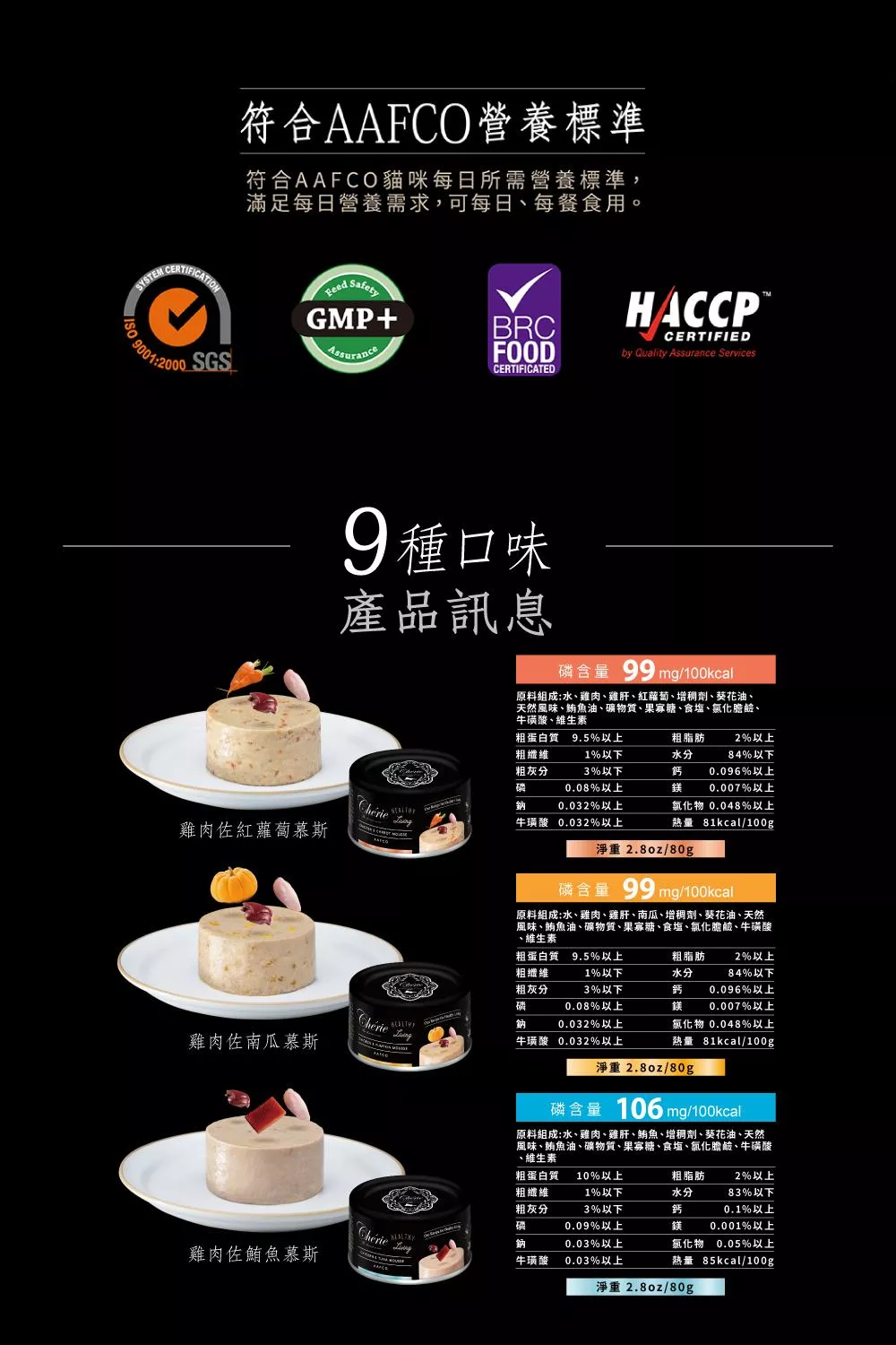 【成 分】全系列共有9種口味(雞肉慕斯/雞肉佐番茄慕斯/雞肉佐鮪魚慕斯/雞肉佐南瓜慕斯/雞肉佐紅蘿蔔慕斯/鮪魚慕斯/鮪魚佐鯖魚慕斯/鮪魚佐鮭魚慕斯/鮪魚佐鯛魚慕斯)