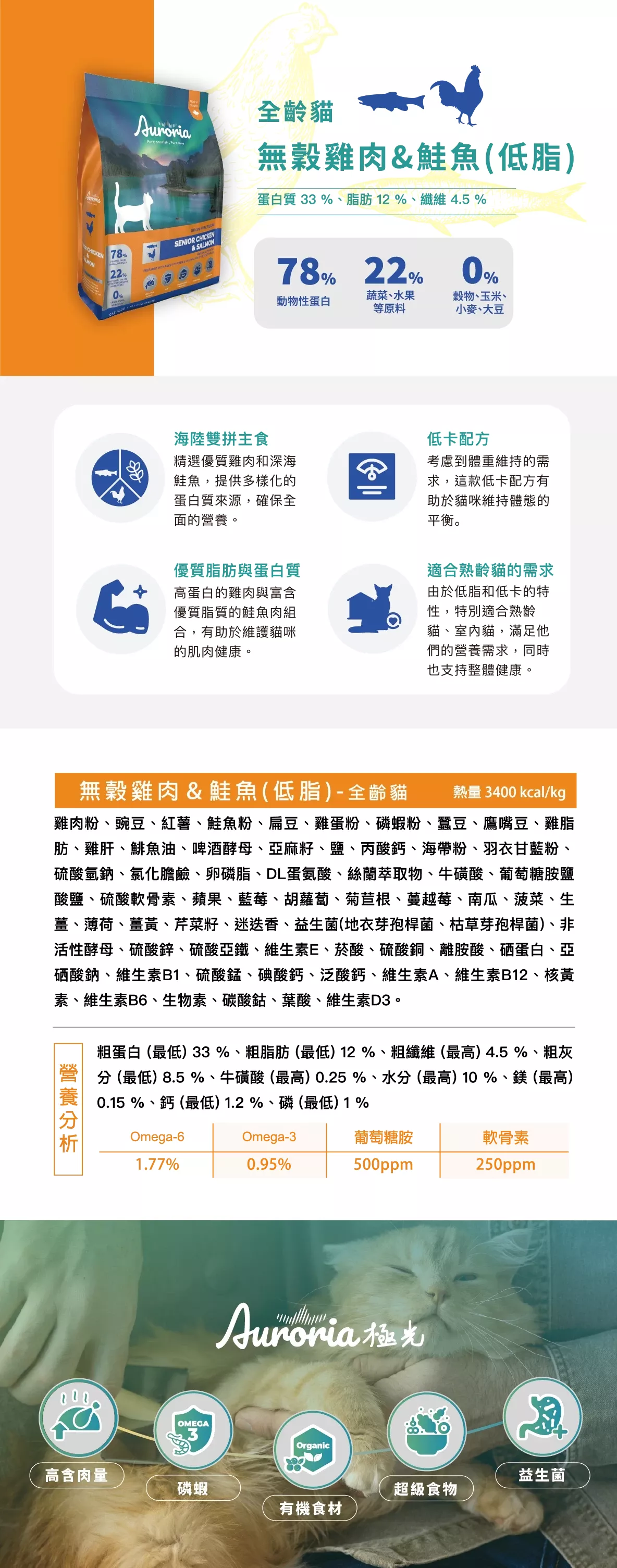 【AURORIA極光】全齡貓 無穀天然糧-雞肉&鮭魚(低脂)|三種規格(1磅/4磅/12磅)